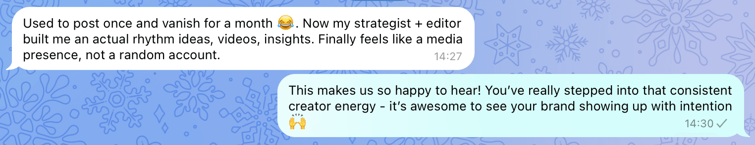 For now – Instagram is our platform we start working on with each founder. In the nearest future we’re going to ideate, script, edit, post for LinkedIn, TikTok, YouTube Shorts, Facebook, and X.
